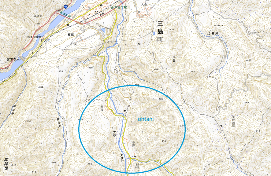 大谷は3区あり上流から本村、中際(なかさい、中世の中在家に由来すると考えられる)、鳥海である。中際の政人さん宅前の水田が縄文時代後期の遺跡であり、故小柴吉男氏により発掘調査が行われ土笛が出土している。大谷川には3カ所橋があったそうで、上中下でサイノカミの祭り後には、芯柱の杉の木を橋に利用していた。村の春日神社の入口の道路脇には石祠がある。この水神には「赤岩掘社中、流水清浄、文政十一季年(1828)子十月村中造立」と刻んである。江戸時代は大谷組の中心地として郷頭宅が置かれ名主宅に隣接し現存している。