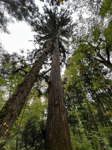 本来天然杉はシトシトと地面を伝う水分を好み緩やかに成長するそうだ。春先に決まって同じ場所でおこる雪崩は、山肌を雪が滑り落ちる際に肥沃な土壌も一緒にさらっていってしまい、その効果によって表土の薄い「雪食地形」を形成する。土壌の水分と栄養が豊かな地にはブナなどの広葉樹が群生するが、雪食地形のような他の樹種が生育しづらい痩せた場所には天然杉や五葉松が成長する。