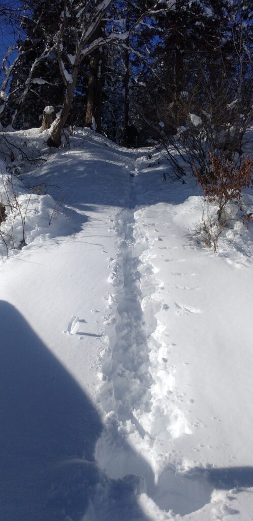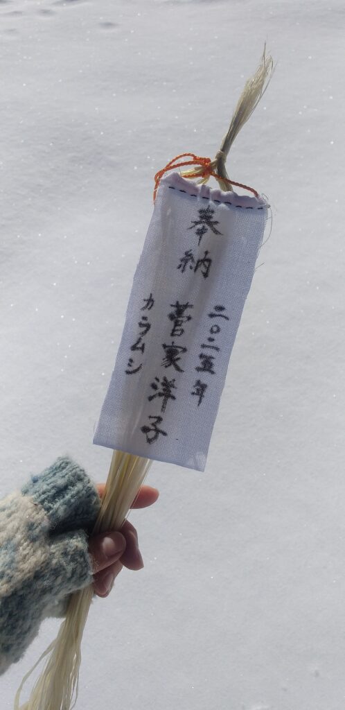 こう思うのは、はじめてではない。夏に引いたからむしを山の神さまに奉納するという、15年近く続けてきた自分なりの習わし。もっと早く済ませておけばよかったのに、結局ひざ丈以上に積もった雪を漕ぎながらお宮に向かうことになってしまった。カンジキを履いて先を歩き、道をつけてくれたのは夫・ヒロアキさん。私もカンジキを履いて急斜面をよいしょよいしょと登り、息を弾ませながら雪道を歩いた。