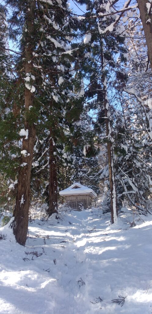 まとまった積雪の後の晴天、日に照らされた雪がきらきらと光を放っている。来春、お宮を囲む杉の木を伐採する計画だという。ずっとここにあった木がなくなるのは、やはりさみしい。そう思いながら木を見上げると、葉に積もっていた雪がバサバサと落ちてきた。杉の木が、心の声に応えてくれたように感じた。