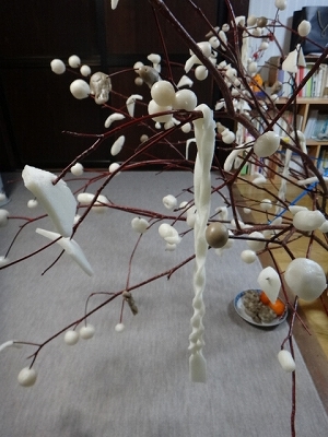 先日、昭和村の交流・観光施設「喰丸小」に出店をしている人たちと、この出店事業「よいやれ屋」を取りまとめる役場職員さんとの意見交換会があった。本屋「燈日草(トモシビソウ)」として、月に数回ほど出店している私も参加した。そのなかで、人出の少ない1月、2月に何か催しをしてはどうかと提案があり、「団子さし」と「豆まき」が候補にあがった。それらの行事については、みなそれぞれに経験や思い出があり、あれやこれや話が大いに盛り上がった。なかでも「やまなみ会」の元気な姉さま3人組が語ってくれるお話は、とても興味深かった。