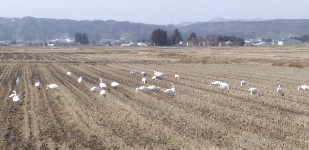 雪のなくなった会津盆地の田んぼに、もう行ってしまっただろうと思っていた白鳥の姿があった。雪が消えると、白鳥もいなくなる。はじめは名残惜しさを感じながらその姿を眺めていたけれど、せっせと落ち穂を食み、羽をぐんと広げるこの白いからだに、これから飛び立ち、長い旅路をゆくための溢れんばかりのエネルギーが満ちているのだと思うと、さみしさよりも、その力強さへの憧れに心が揺れた。自然や生きものたちが見せてくれる、変わりゆく季節へ向かう姿に励まされ、私の心も少しずつ春に向かっていける。